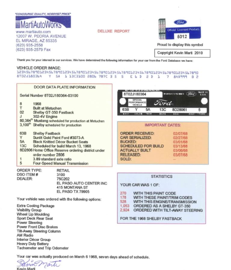 This is an original S Code 390 GT fastback - there are too many options to list, they are all shown on the Marti Report that can be clicked on. - among the rarest option on this car is the factory deluxe black out hood treatment which is documented in the paint code of M5. Factory bucket seat headrests are also rare. Note that this GT is original paint (never resprayed ) original panels and a one owner Fastback loaded with all the desirable options. It is rare these days to find a Mustang that is completely original and untouched. The body on the GT is in nice shape and is mostly rust free. Floors are excellent - little bit of rust under hood lip, bottom of doors and small spot on drip rail, all of these are minor and can be fixed during resto. New BFG Radials have just been fitted to Fastback (245. 60 by 14 rear and 225. 60 by 14 on front ) ( fitted after photos taken). Car runs and drives - has original engine. Want a rare Fastback - this is it