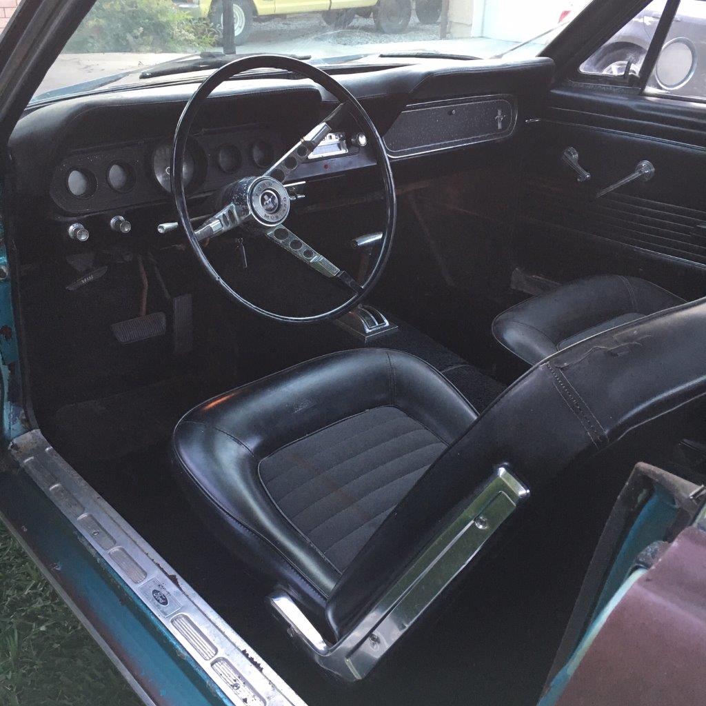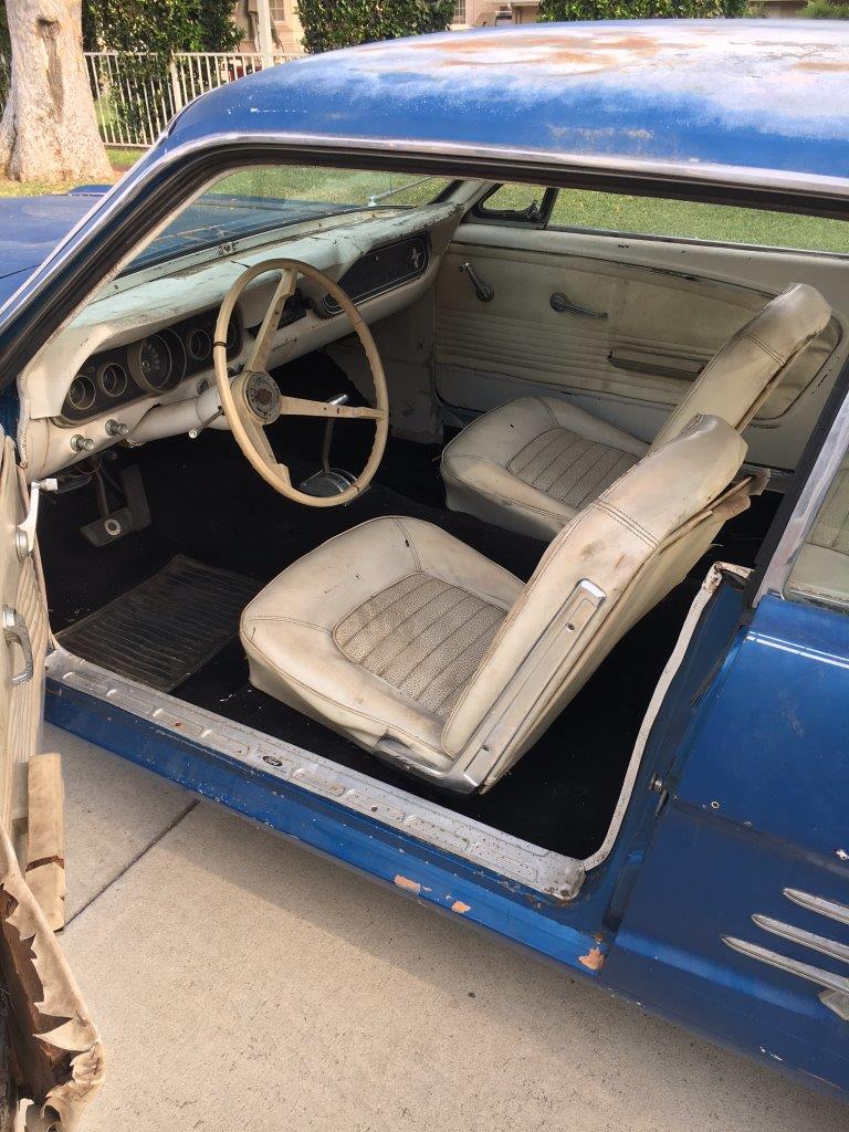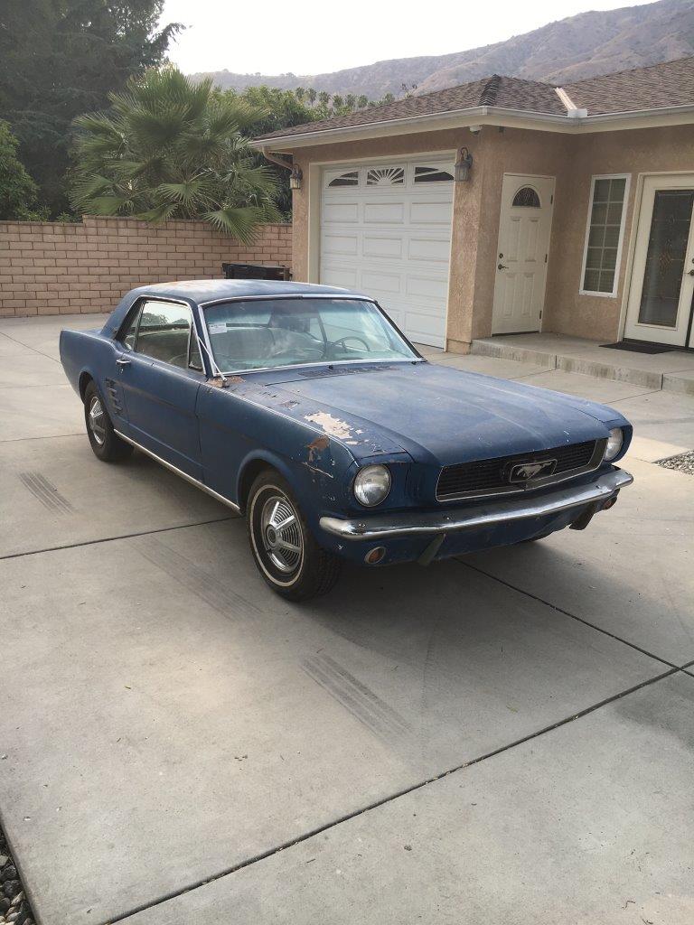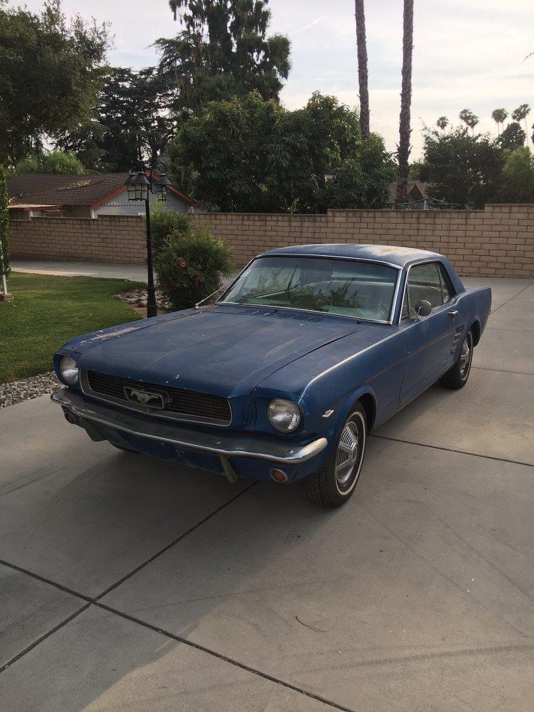 1966 Ford Mustang Coupe 289 V8 auto VIN 6T07C160162 Options 1) power steering 2) factory disc brakes : This is a 1966 Mustang coupe- project car. Equipped with the original 'C' code V8 289 2V engine, C4 auto transmission, power steering, & Kelsey factory disk brakes. Engine does fire & run ok but will need carb, tune up parts, & gaskets. Car sat for 20 years so will need full brakes & fuel system at a minimum. Car was rear ended (prior to current blue paint job) on left rear which impacted frame rail & trunk floor. Left quarter will need re skinned after proper frame pull. Right quarter decent & right frame ok. Car has some rust in rear floors, right hand rear 'C' pillar, & a few other small spots. Not a rusted out back east car since it has been in California for most of it's life, but will need some rust repair as noted. Very cheap car with good options & disk brakes for the project enthusiast. due in late september SOLD Car ID#603 - Return to Index |