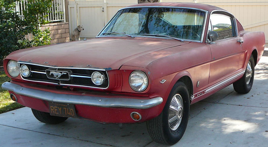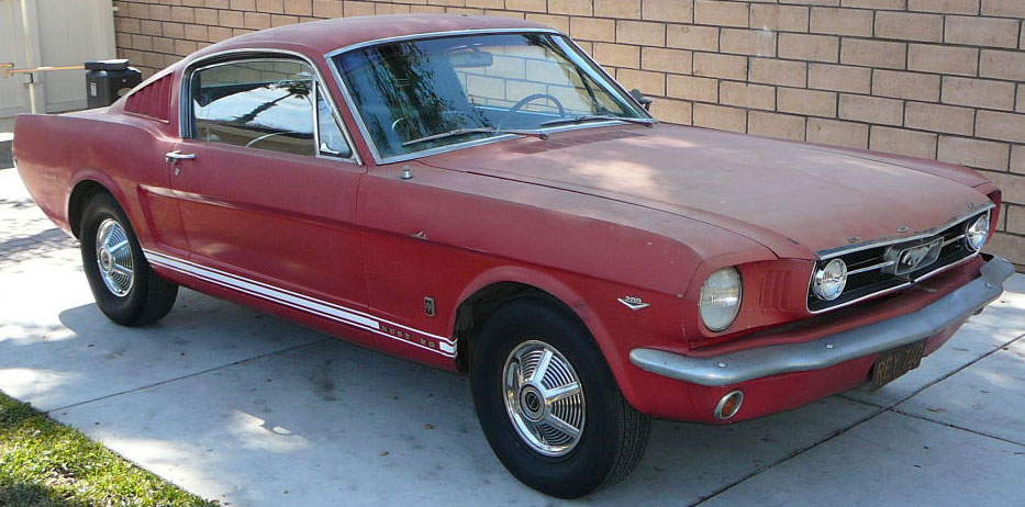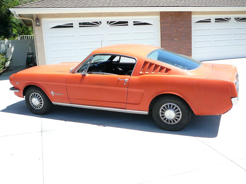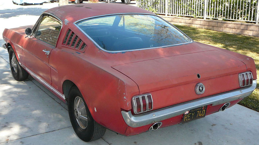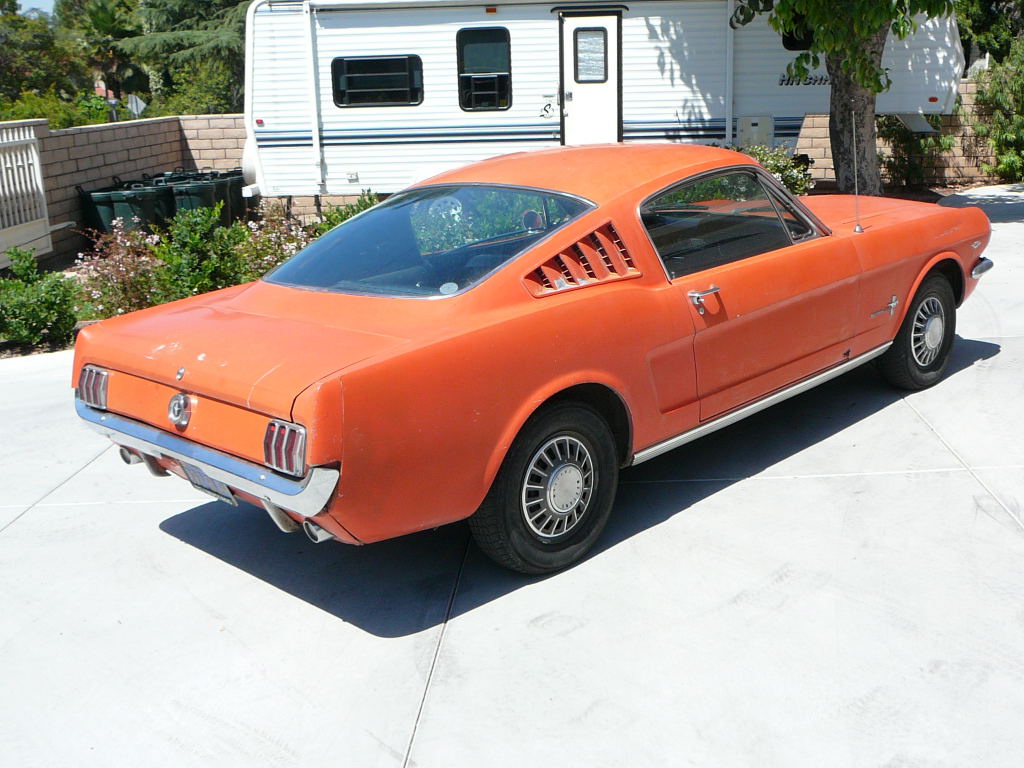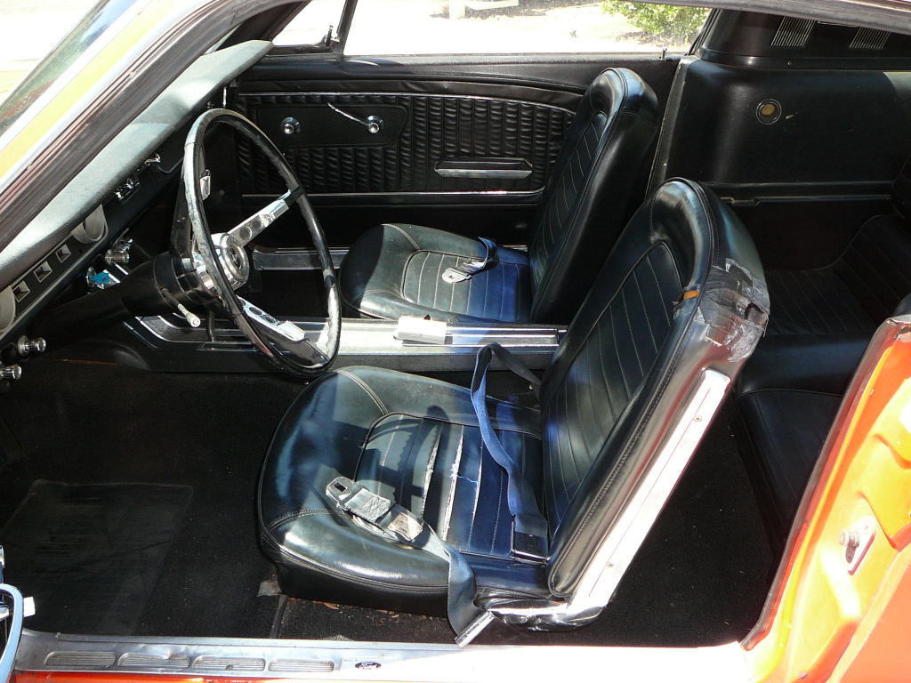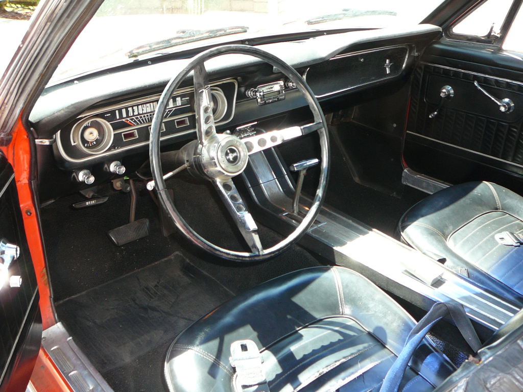 Original C code Fastback that has power steering and centre console. Nice bodied Mustang without rust or accidents. Black plate Californian car that runs and drives OK. Originally was Champagne Gold now faded Poppy Red. Original standard black interior, no radio or speaker cuts to fibreglass or dash. Fold down rear seat in VGC. Another good example of a first gen fastback.