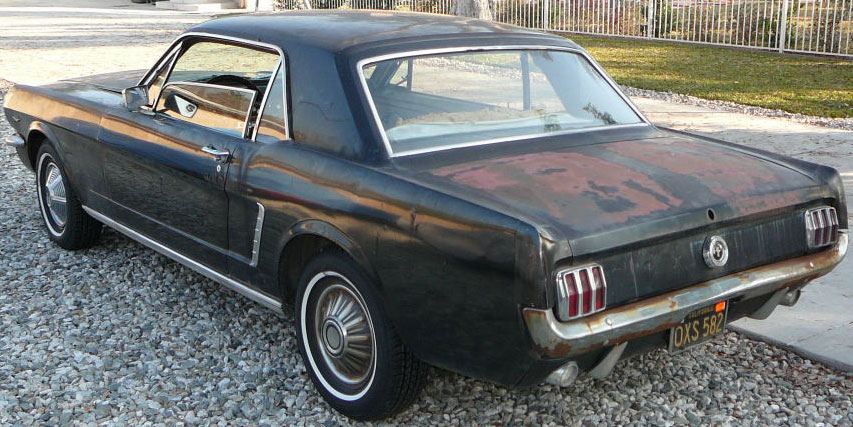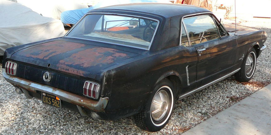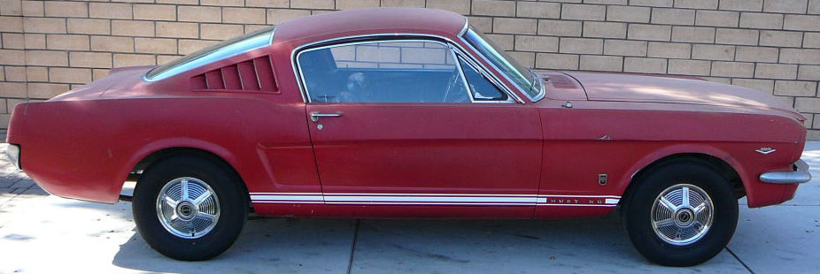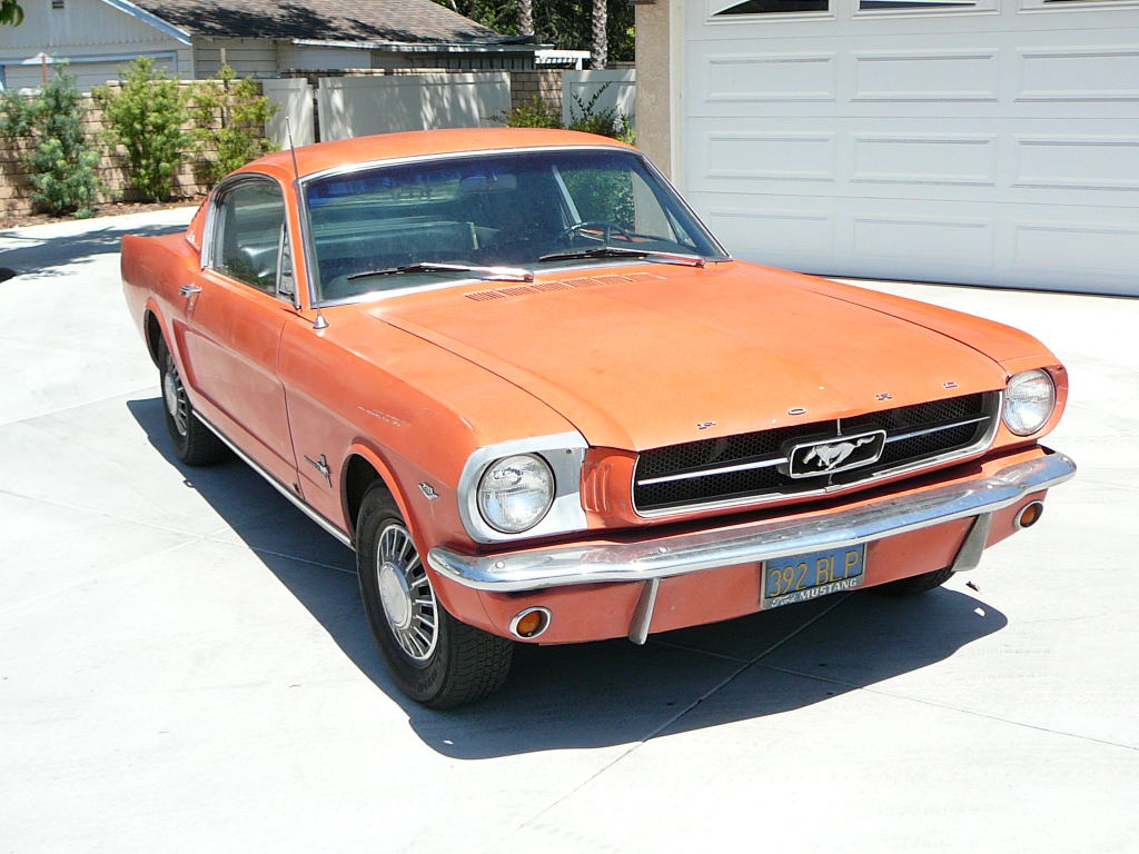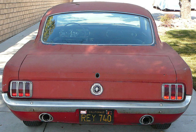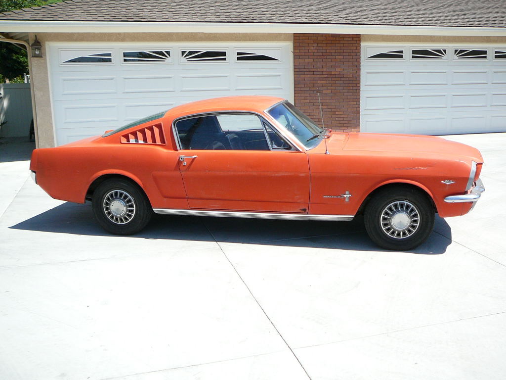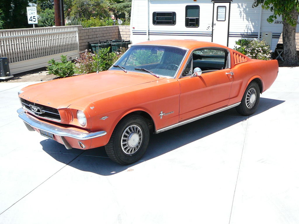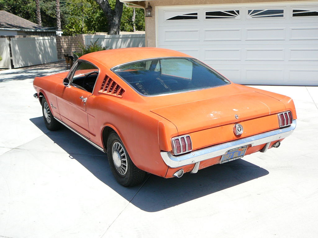 Original C code Fastback that has power steering and centre console. Nice bodied Mustang without rust or accidents. Black plate Californian car that runs and drives OK. Originally was Champagne Gold now faded Poppy Red. Original standard black interior, no radio or speaker cuts to fibreglass or dash. Fold down rear seat in VGC. Another good example of a first gen fastback.