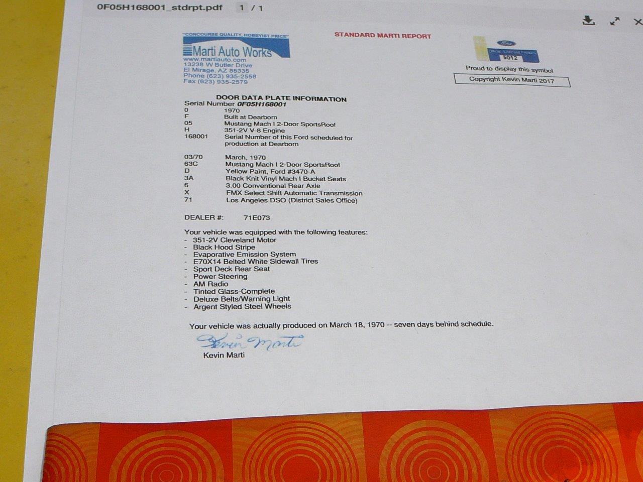 1970 Ford Mustang Fastback Mach 1 V8 4V Cleveland Auto VIN OR05M103268 Options include SOLD Car ID#570 - Return to Index |