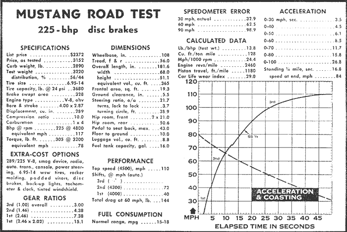 Fat-treaded tires are not to be discounted in their aid to braking as well as traction (which amount to the same thing), but the normal road test braking results corresponded well with earlier comparative tests which Car Life conducted among all five domestic makes which offer the disc systems. At that time, 10 consecutive stops were made from 80 mph and the Mustang averaged between 24 and 26 ft./sec./sec., with a one-time best stop of 29. However, the same tendency for the rear to lock was evident then, to a greater degree than was the case with Continental and Thunderbird. It would seem that the pressure limiting valves for the rear hydraulic lines on the latter two, designed to overcome this problem, did somewhat the better job. They cut in at 450 psi line pressure while the Mustang's goes to work at only 300.